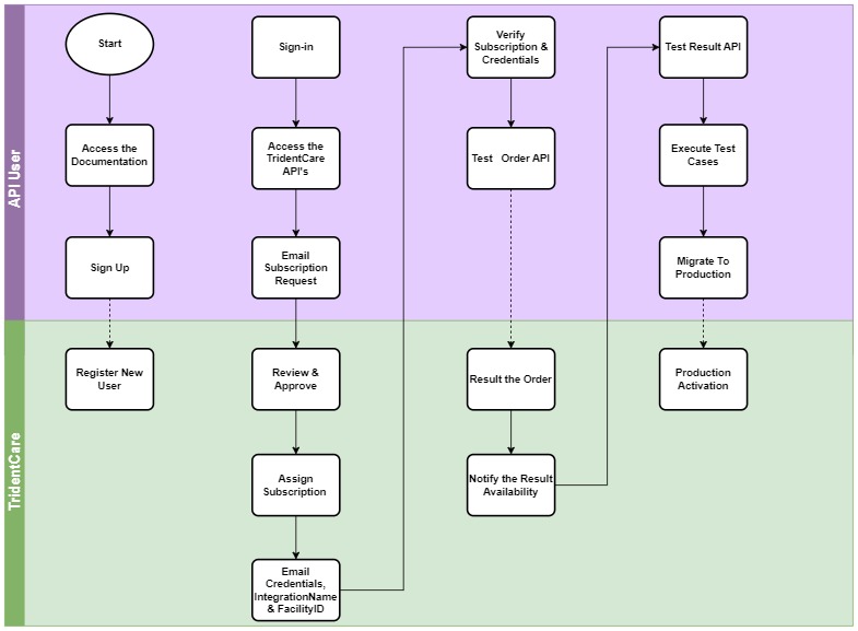 To consume the new API resources, clients must subscribe to the API service by registering on the portal or by emailing TridentCare integration support team at api@tridentcare.com. The API offers the ability to submit new orders, modify or cancel an already submitted order, track the status of the orders and to get the results.
